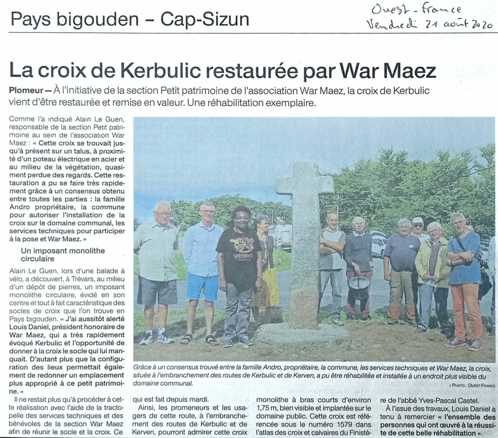 À l’initiative de la section Petit patrimoine de l’association War Maez, de Plomeur (Finistère), la croix de Kerbulic vient d’être restaurée et remise en valeur.